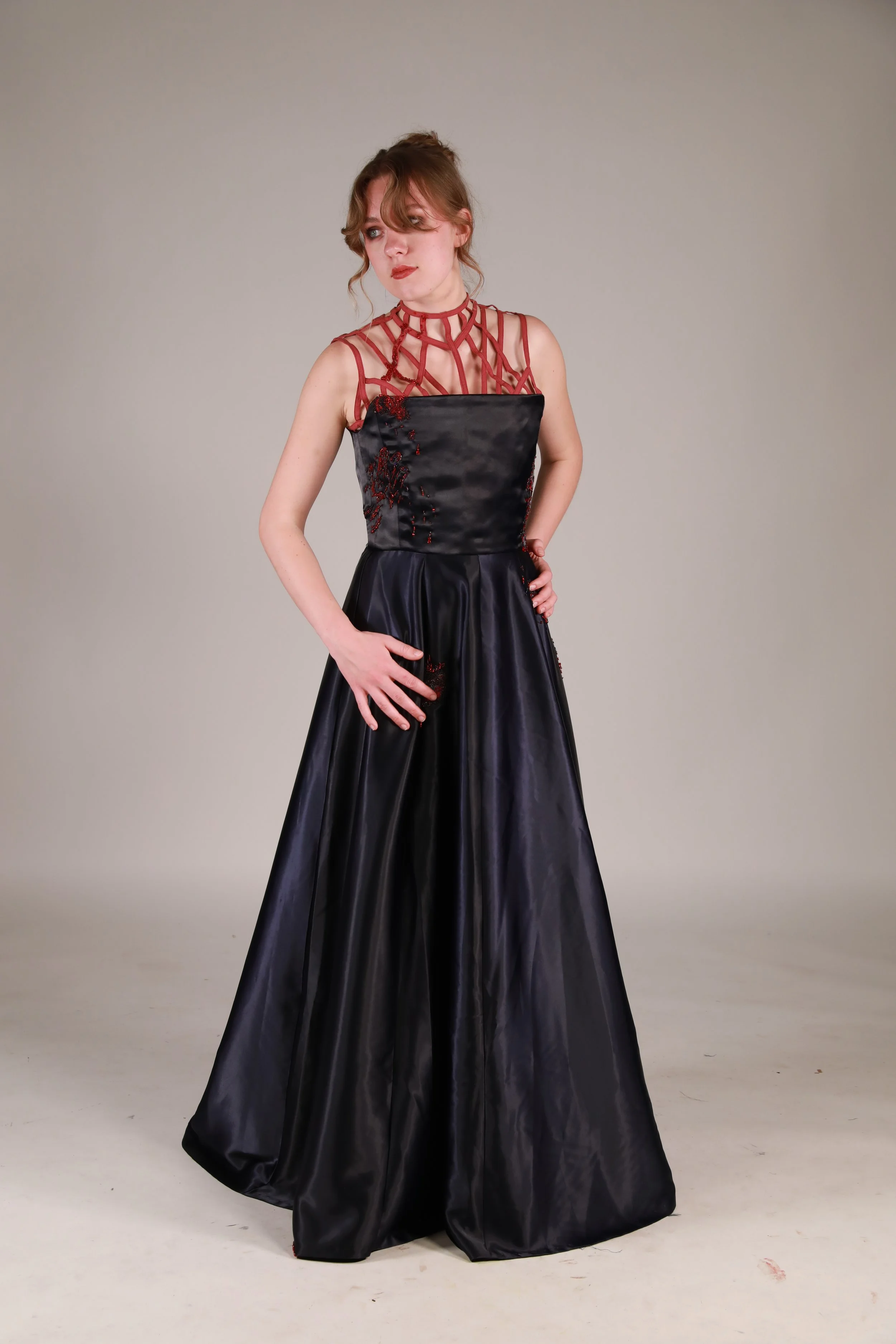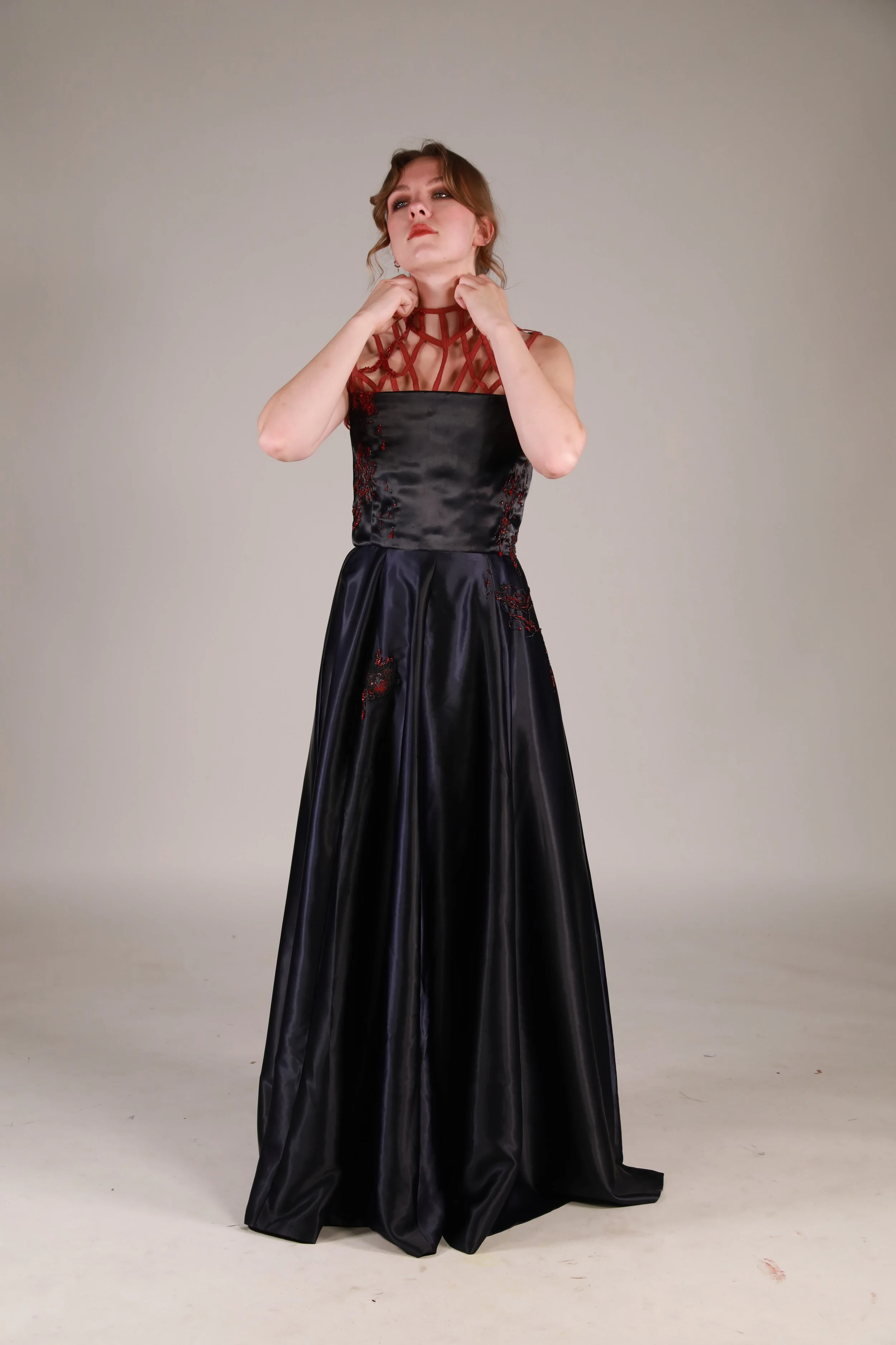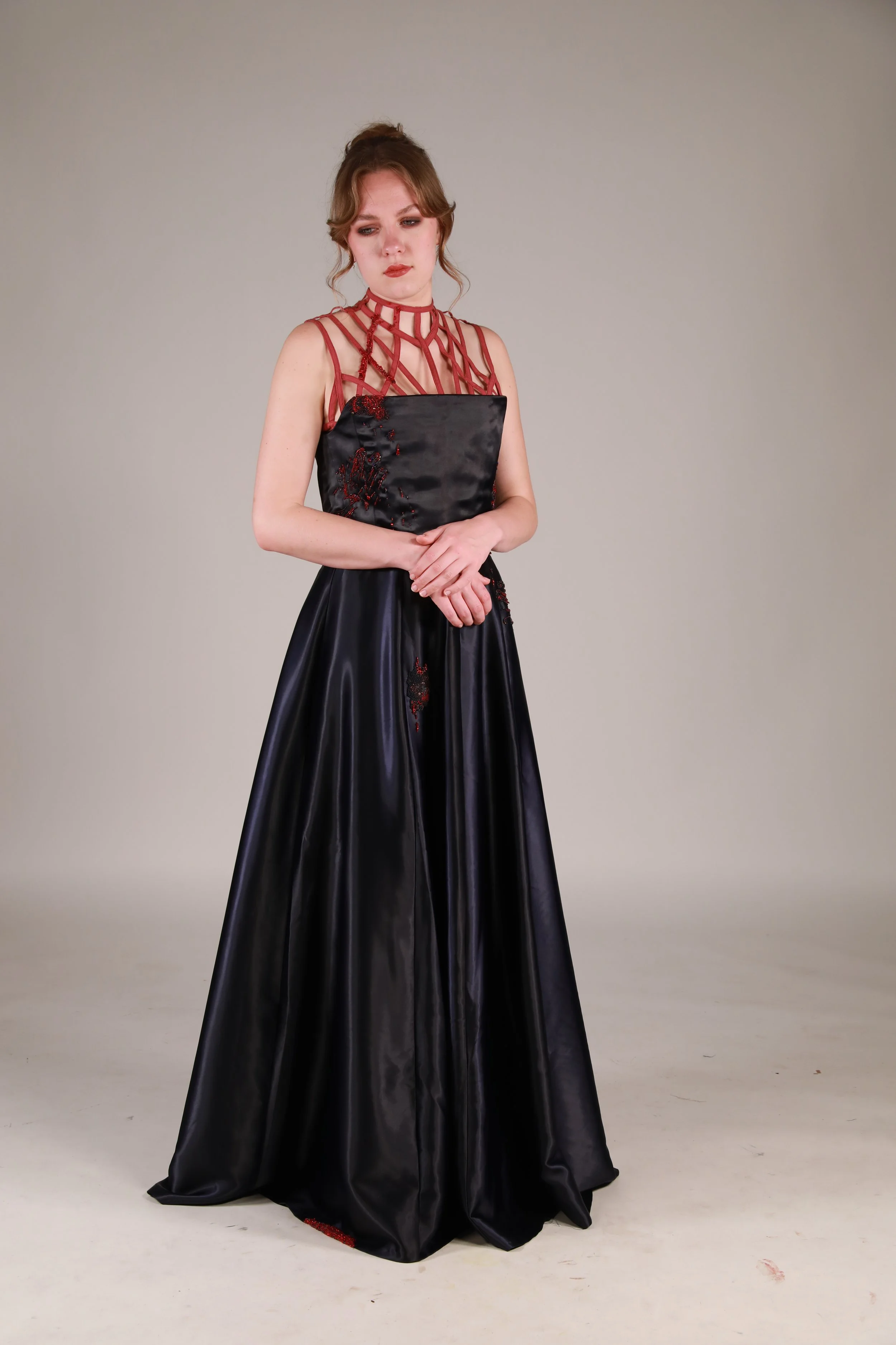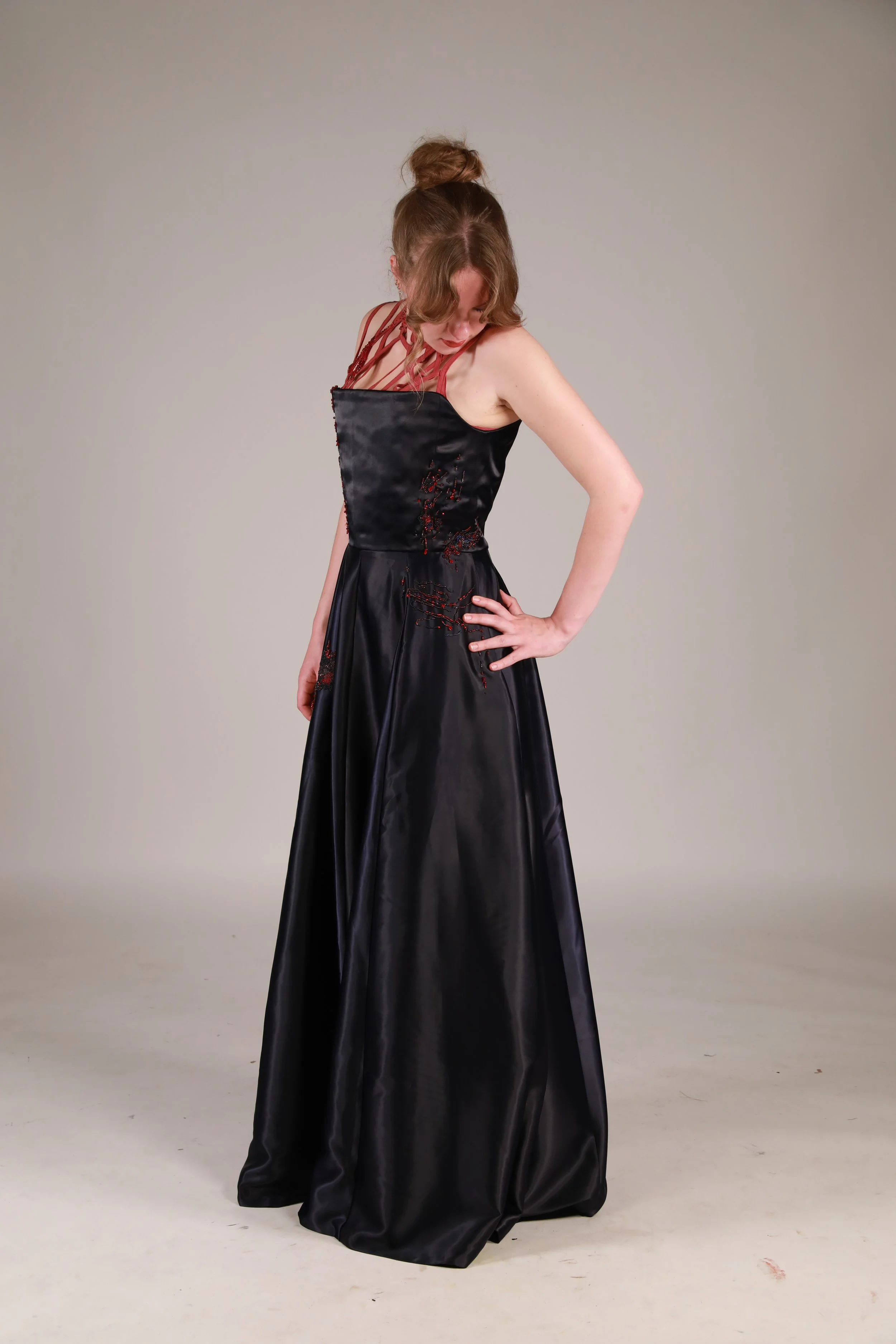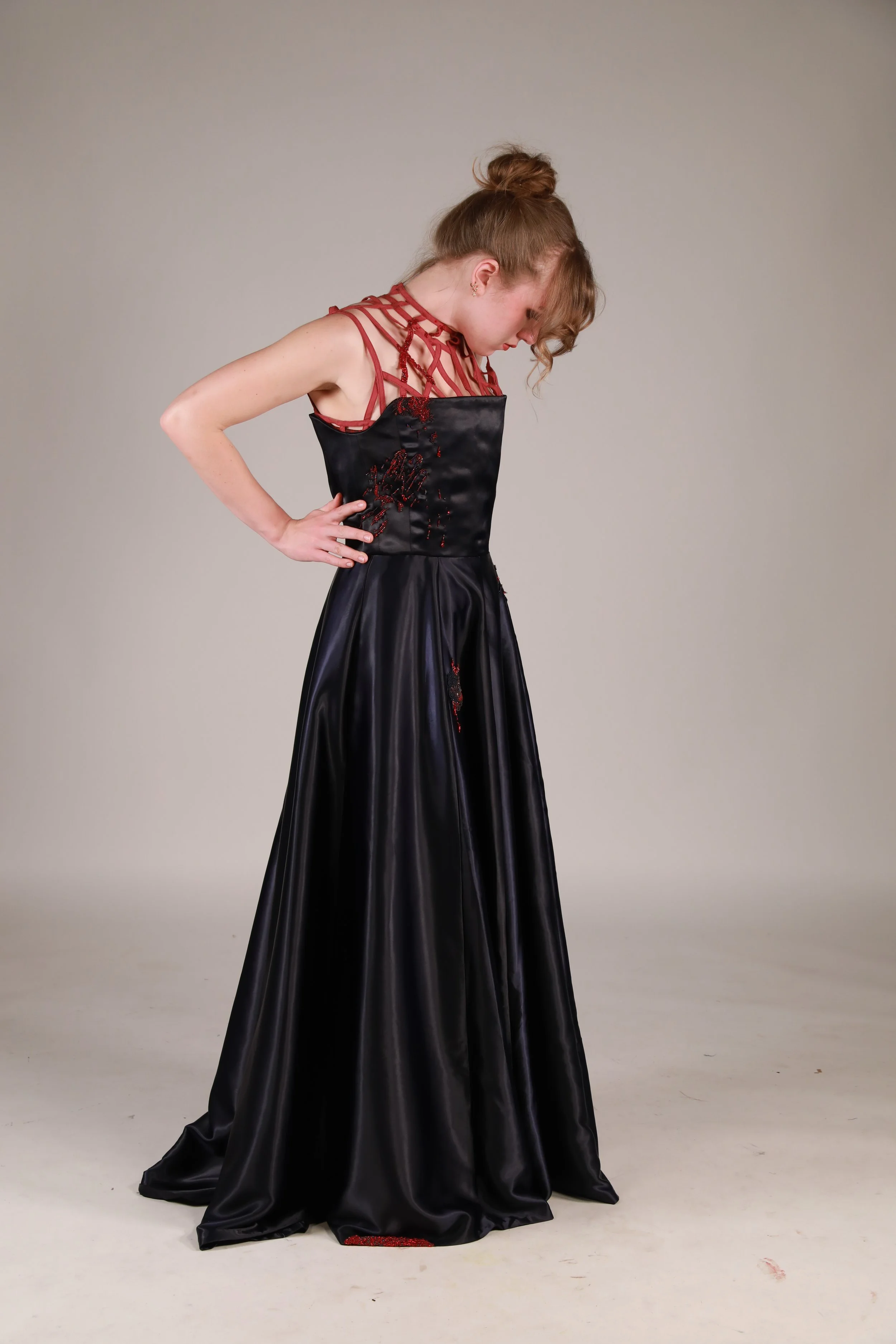 Lady Macbeth (2024) This is a satin dress hand beaded to resemble blood where Lady Macbeth has wiped her hands on her dress. the harness is made from hand dyed cotton fabric and attaches to the Tudor inspired corset underneath.